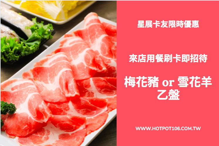 卡友好禮|來火鍋106 內用刷星展信用卡|享梅花豬or雪花羊 (活動已結束) 持有星展信用卡的鍋友,福利來了! 即日起,店內用餐結帳刷星展信用卡 火鍋106招待「梅花豬或雪花羊」乙盤!*活動已結束 這麼好康的小確辛怎能錯過 馬上打開line群組~呼叫有星展卡的朋友 揪團前往火鍋106吃鍋啦! p.s.請在點餐時主動告知刷星展卡唷 點我訂位 * 以上優惠內容依店內實際公告為準 * 火鍋106 保有修改或終止之權利 + There are no comments Add yours 取消回覆CommentNameEmailUrl