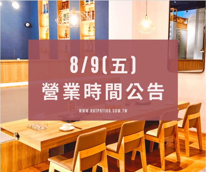 🌀利奇馬颱風 營業時間異動公告 8/9(五)颱風天緊急公告 Dear 鍋友們 因應颱風來襲~營業時間變動如下! 【台北】南京店、吉林店、光復店、內湖店 8/9 下午四點開始營業 【台中】公益店 8/9 照常營業 利奇馬颱風來勢洶洶 鍋友們要注意安全喲!!! p.s. 台北的鍋友們,晚上來用餐前請打電話與我們確認一下唷~ 點我看菜單 + There are no comments Add yours 取消回覆CommentNameEmailUrl
